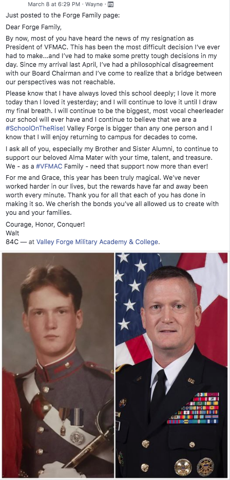 Please know that I have always loved this school deeply; I love it more today than I loved it yesterday; and I will continue to love it until I draw my final breath. I will continue to be the biggest, most vocal cheerleader our school will ever have and I continue to believe that we are a #SchoolOnTheRise! Valley Forge is bigger than any one person and I know that I will enjoy returning to campus for decades to come.